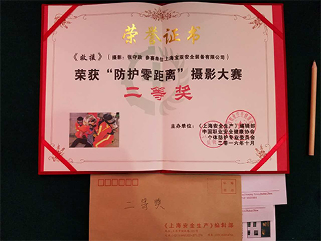 會(huì)議期間,主辦單位頒發(fā)了“防護(hù)零距離”系列講座各個(gè)獎(jiǎng)項(xiàng),上海寶亞安全裝備股份有限公司以作品“救援”榮獲本次活動(dòng)攝影大賽二等獎(jiǎng)。