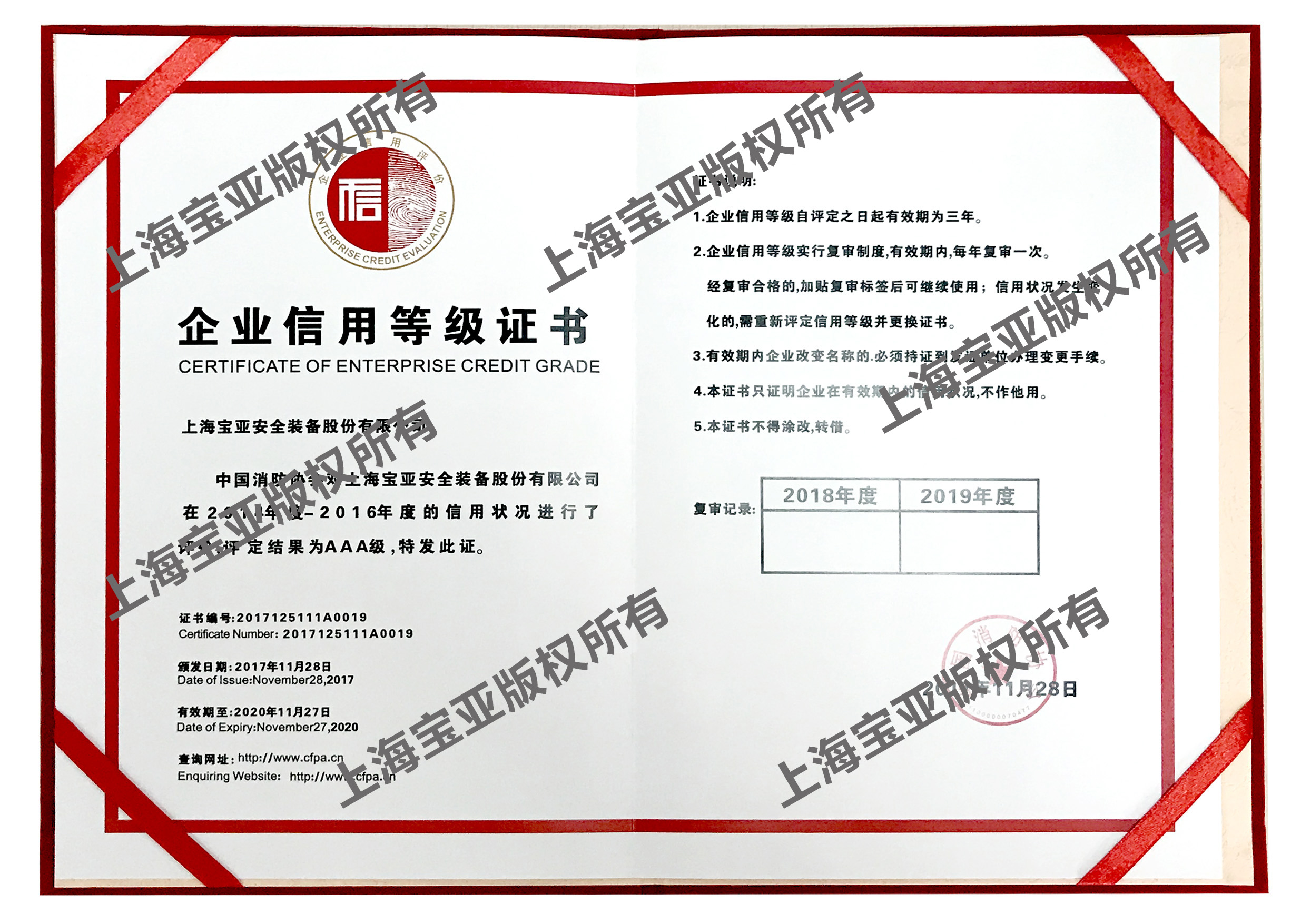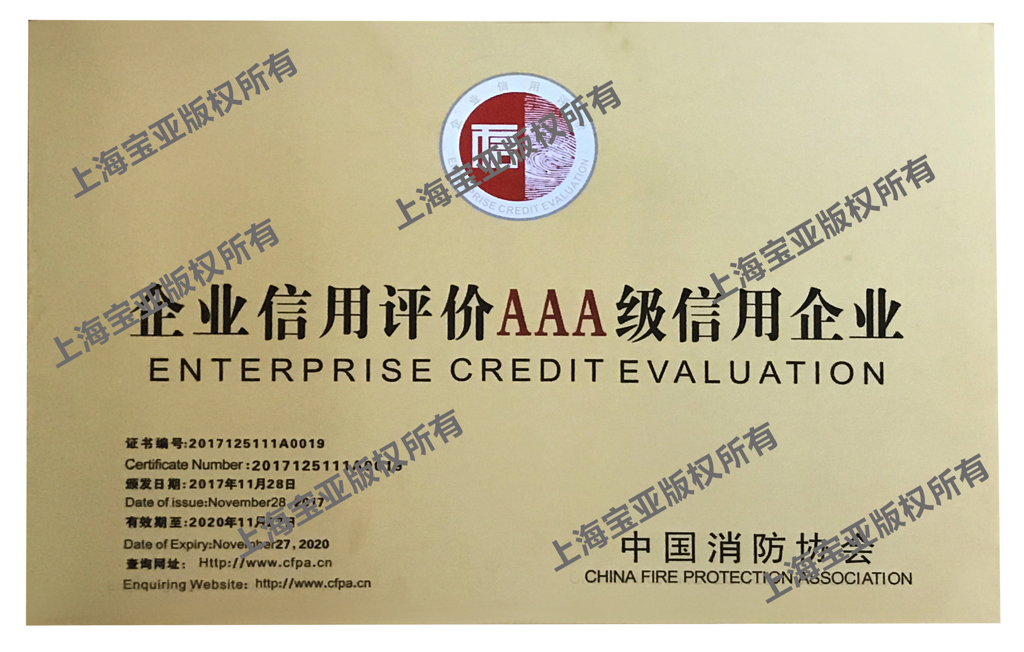 根據(jù)中國消防協(xié)會“消防行業(yè)信用等級評價管理辦法”關于“信用等級有效期為三年,每年復審一次,三年期滿后應重新評審”。經(jīng)過協(xié)會信評部初審、第三方評價機構(gòu)測評、協(xié)會信評委審核,上海寶亞獲得企業(yè)信用等級3A級稱號(該級別為行業(yè)內(nèi)最高級別),證書有效期為2017年11月28日-2020年11月27日。見官網(wǎng)發(fā)布信息:http://www.cfpa.cn/manage/html/201711/855.html