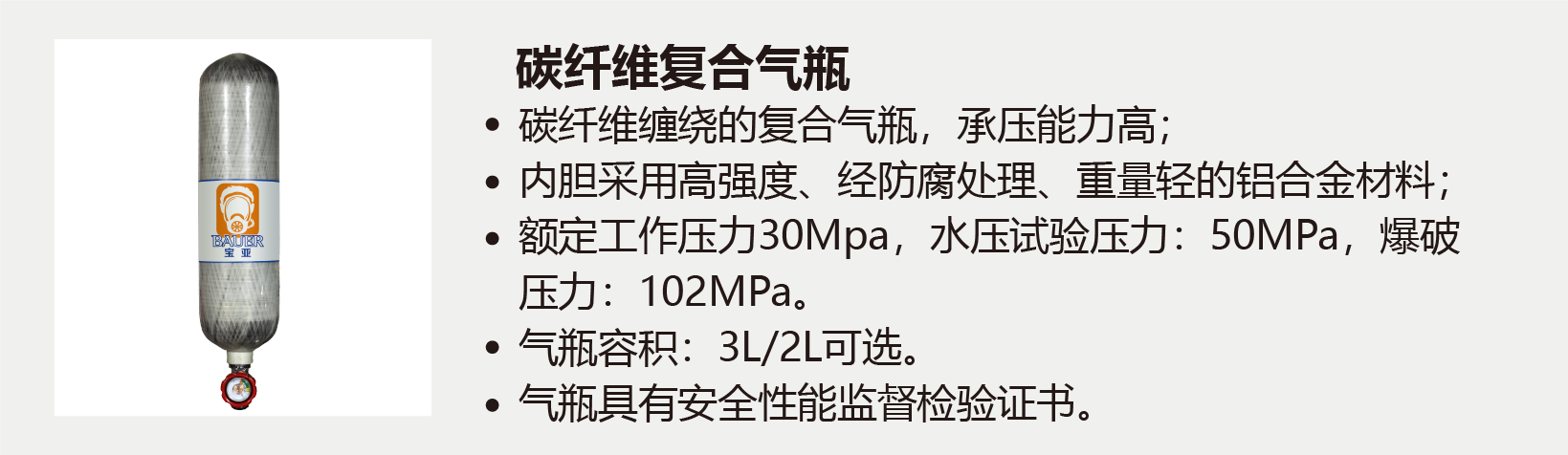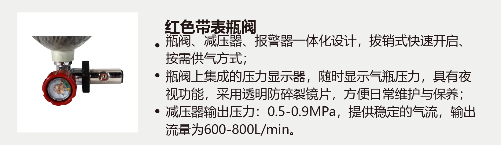 1. 緊急逃生呼吸器—按需式由碳纖維復(fù)合氣瓶、集成式減壓器(含瓶閥、壓力表、報(bào)警哨)、供氣閥、全面罩、挎包組成;