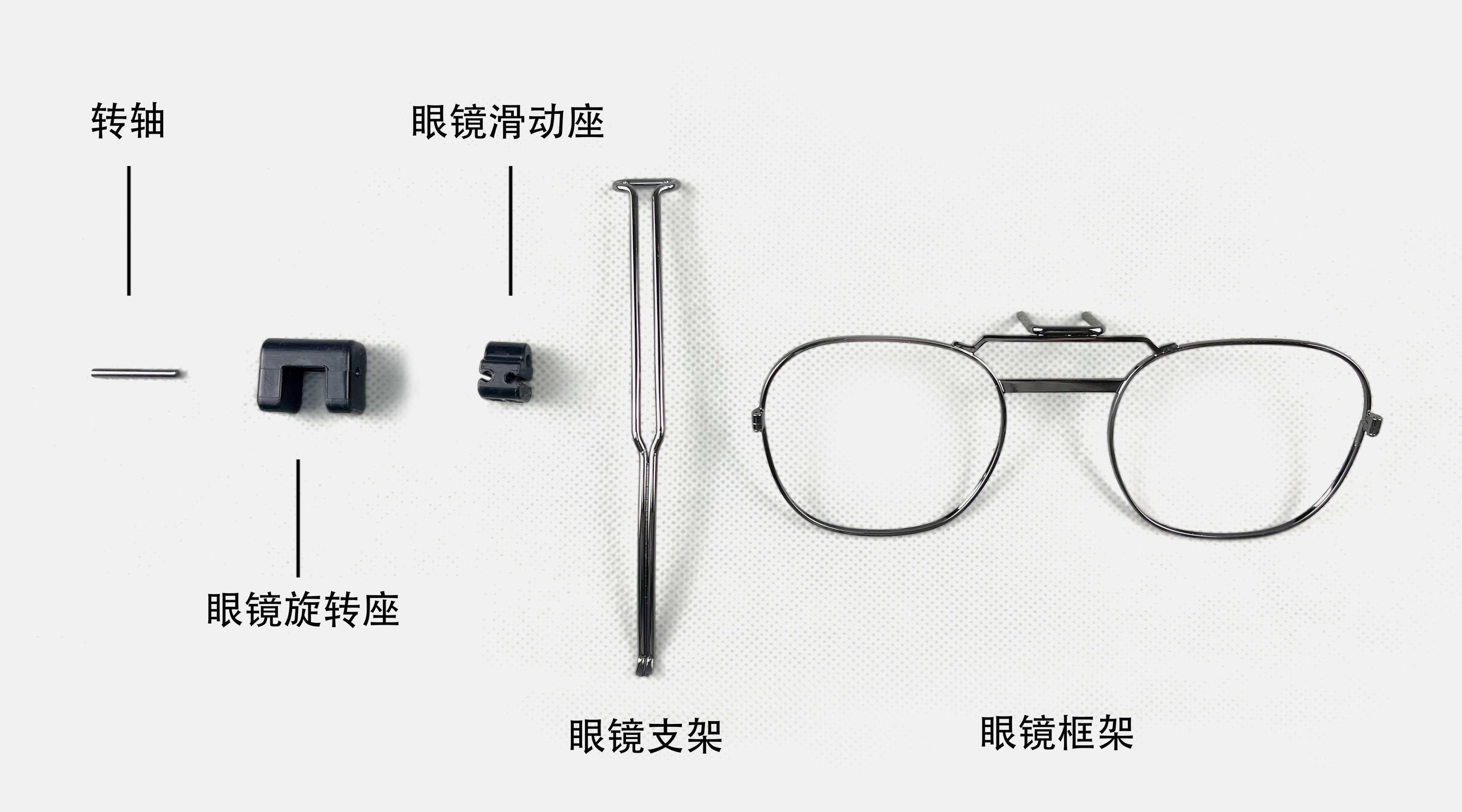 準(zhǔn)備好眼鏡支架的所有物料轉(zhuǎn)軸、眼鏡旋轉(zhuǎn)座、眼鏡滑動座、眼鏡支架、眼鏡框架