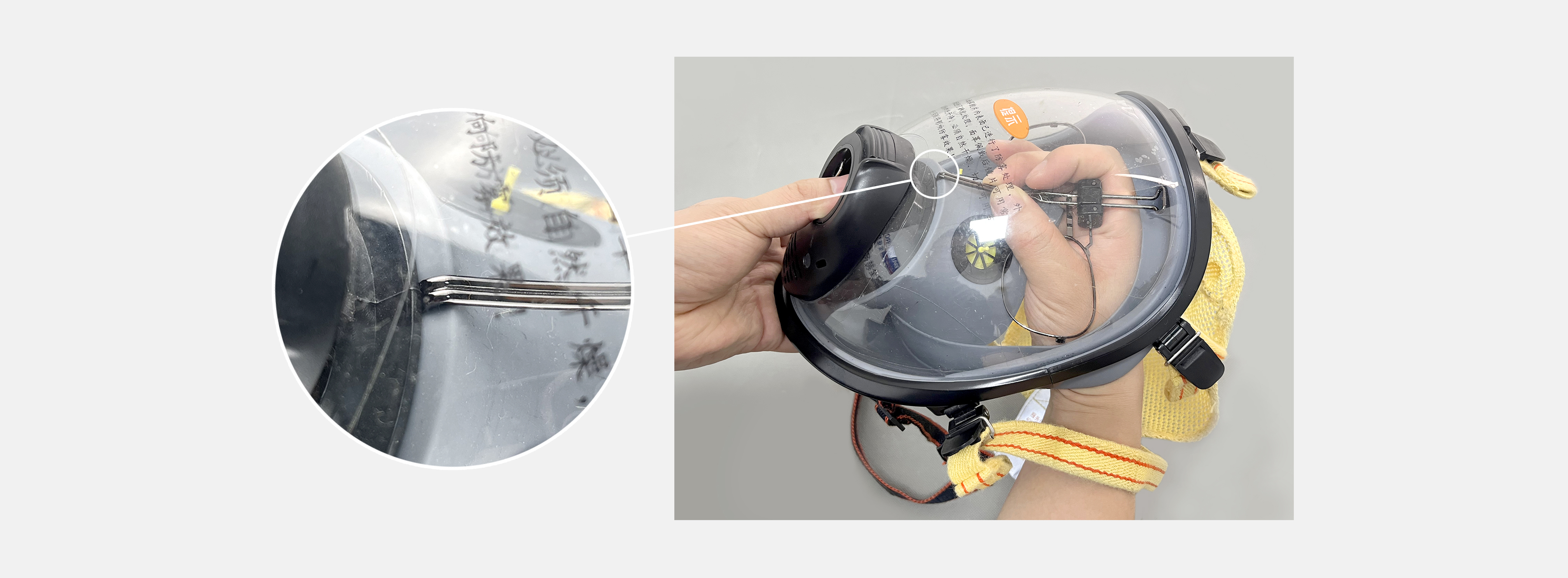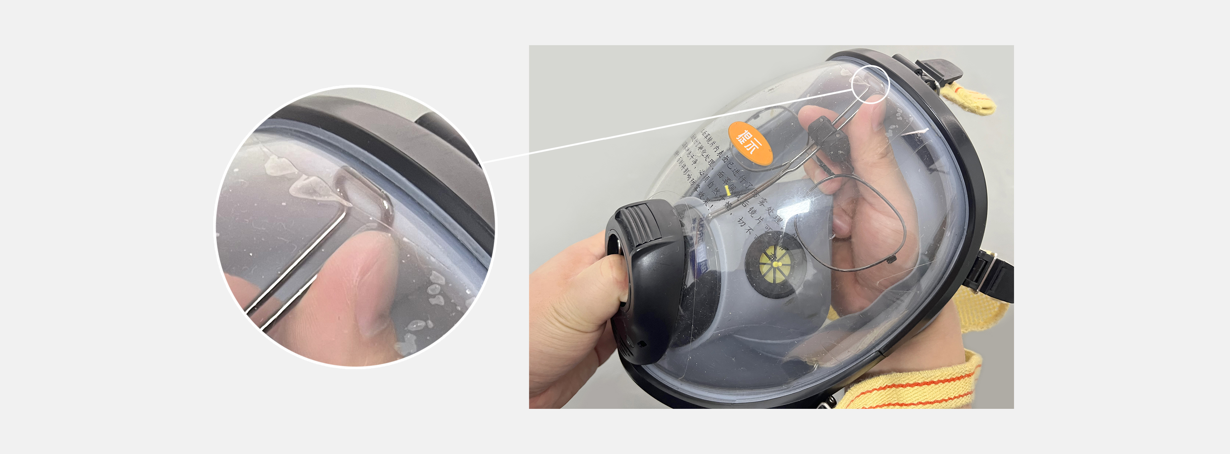 將眼鏡支架的鉤卡進(jìn)口鼻罩膠體塑膠的間隙